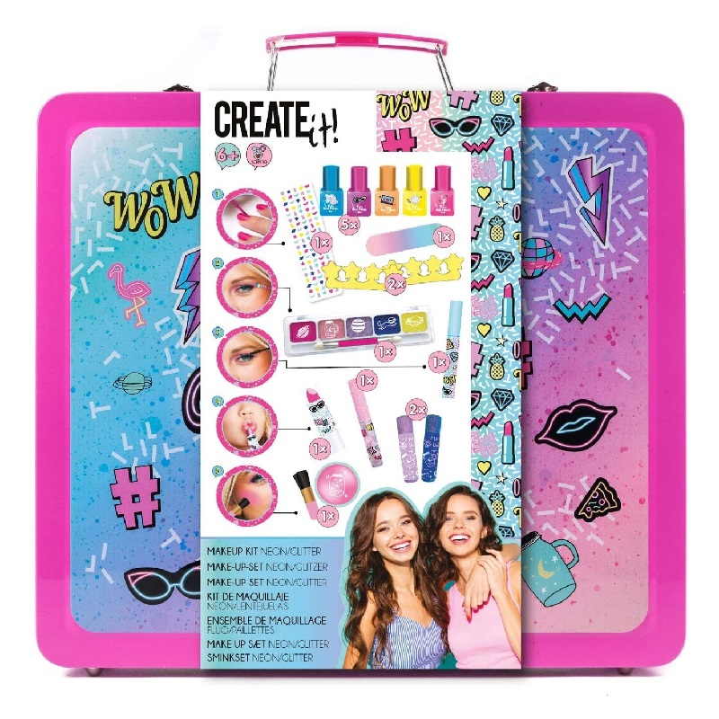 Σετ μακιγιάζ για κορίτσια, που περιλαμβάνει 5 βερνίκια των 8ml, 2 lip balm, 1 lip gloss, 1 color changing lipstick, μία παλέτα σκιών με πέντε χρώματα, ένα χρώμα κιμωλίας για τα μαλλιά με σφουγγαράκι, δύο διαχωριστικά νυχιών, μία λίμα, μία καρτέλα αυτοκόλλητα νυχιών και ένα μεταλλικό βαλιτσάκι για την αποθήκευση και μεταφορά τους.