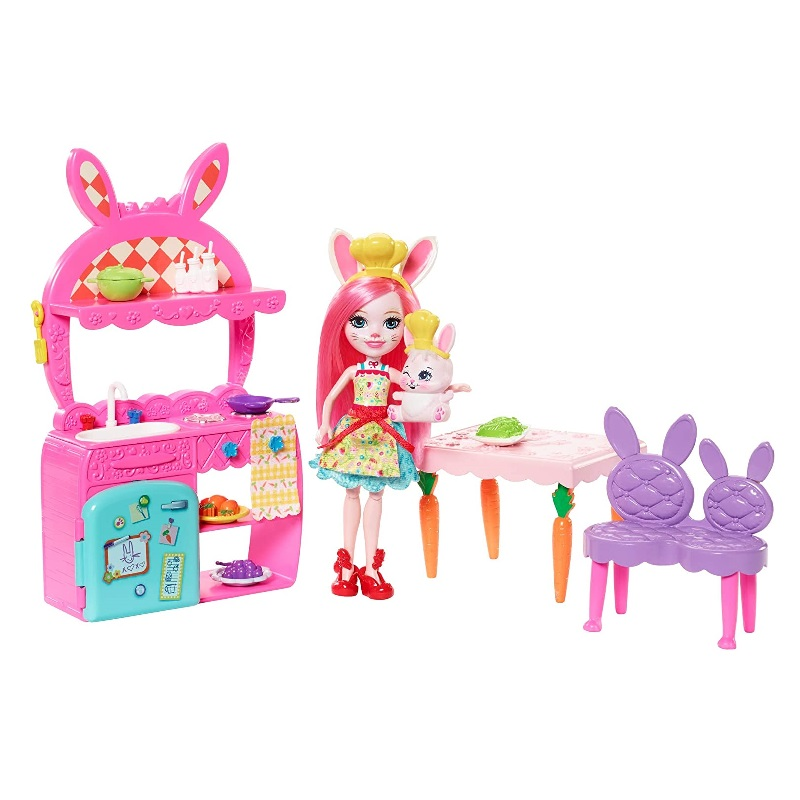 Περιλαμβάνονται: μια κούκλα Enchantimals 15 εκ., ένα ζωάκι-φιλαράκι, κουζίνα, μαγειρικά σκεύη που μπορούν να συνδεθούν με τα χέρια της κούκλας, μια τραπεζαρία και δύο ενιαία καθίσματα.