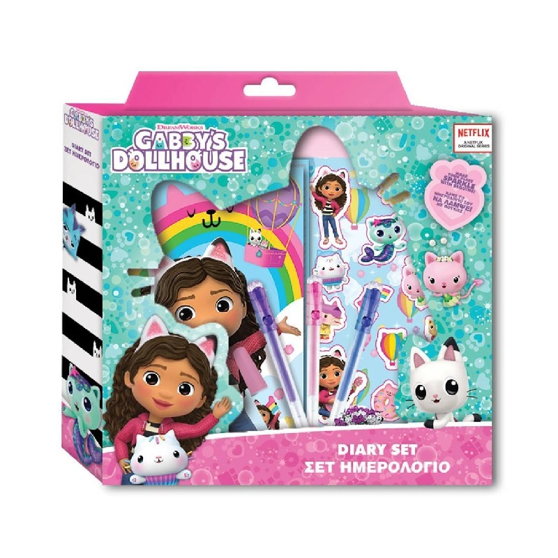 Ημερολόγιο Gabby's Dollhouse με 3 στυλό, αυτοκόλλητα και πολύχρωμες πούλιες για διακόσμηση, κατάλληλο για την αποτύπωση όλων των καθημερινών σκέψεων, ονείρων και συναισθημάτων κάθε παιδιού!