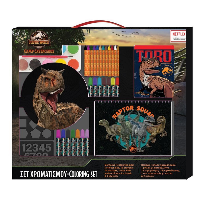 Περιλαμβάνει: Μπλοκ Χρωματισμού, Αυτοκόλλητα, 14 Μαρκαδόρους, 12 Κηρομπογιές, Νερομπογιές, Πινέλο, 2 Στενσίλ.
