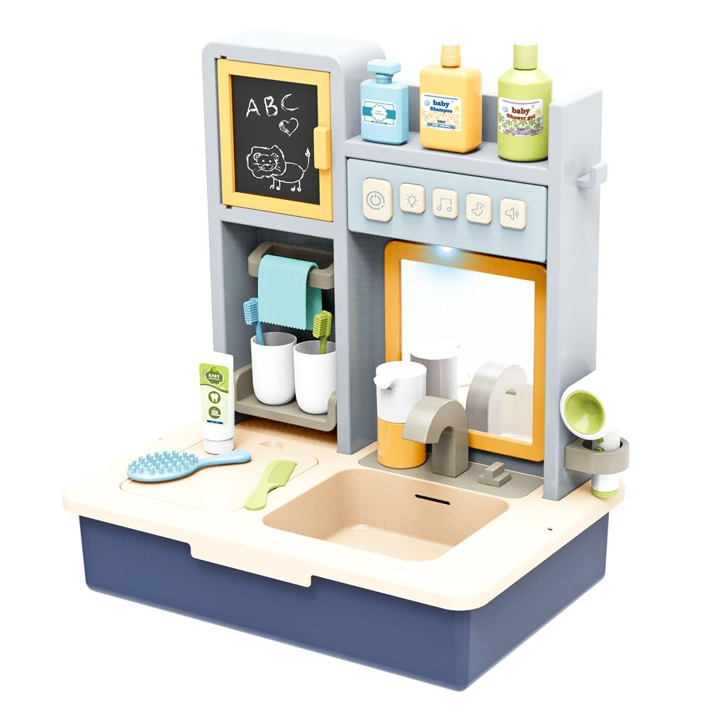 - Περιλαμβάνει νιπτήρα, βρύση με νερό, διάφορα αξεσουάρ μπάνιου, μαυροπίνακα, κ.ά.