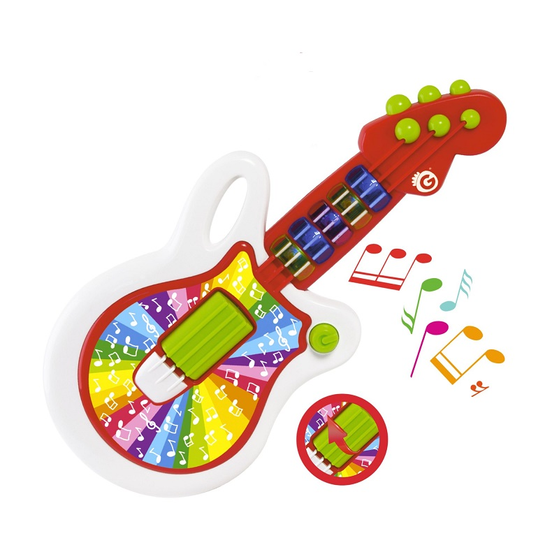 Πατώντας το κουμπάκι στο κέντρο της κιθάρας ή τα πολύχρωμα κουμπιά που βρίσκονται στο ύψος των χορδών, ακούγονται χαρούμενες μελωδίες και τραγουδάκια.