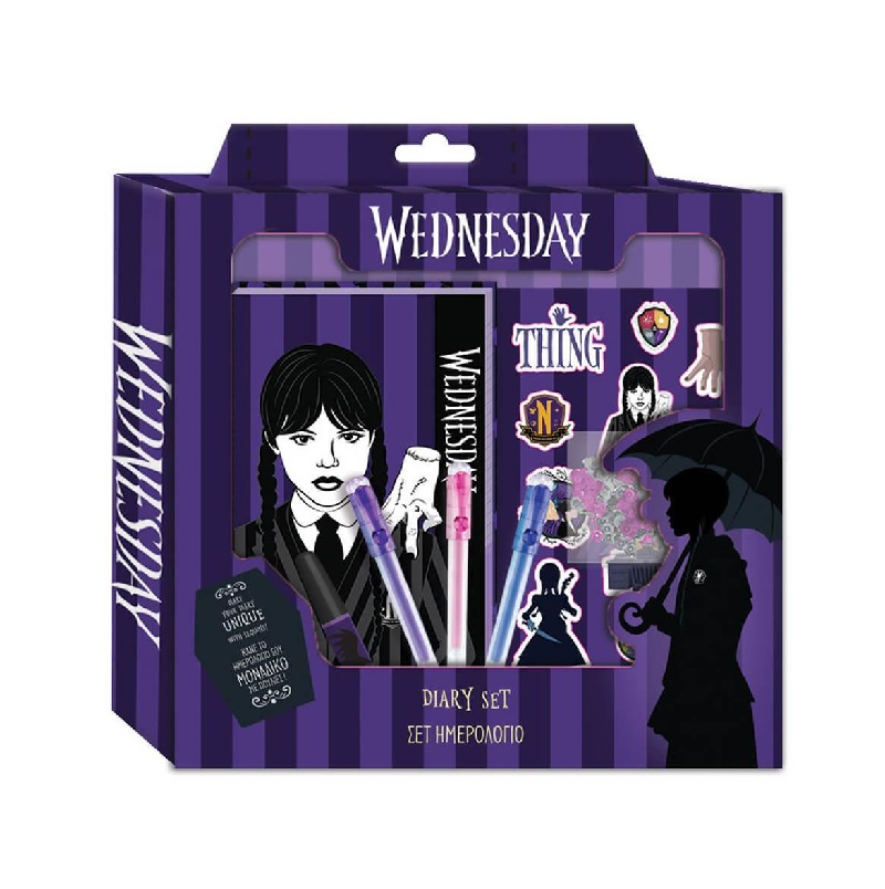 Ημερολόγιο Wednesday με 3 στυλό, αυτοκόλλητα και πολύχρωμες πούλιες για διακόσμηση, κατάλληλο για την αποτύπωση όλων των καθημερινών σκέψεων, ονείρων και συναισθημάτων κάθε παιδιού!
